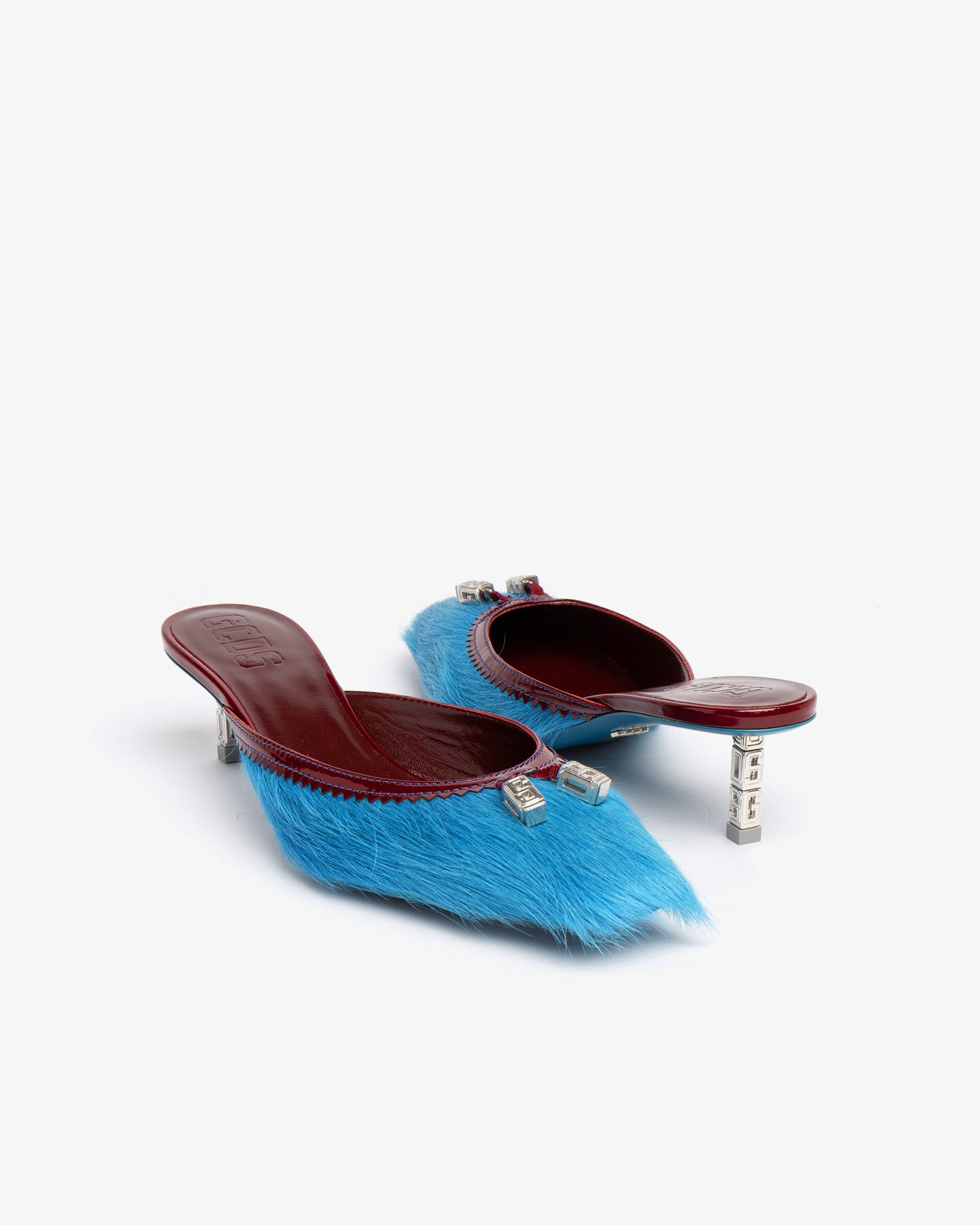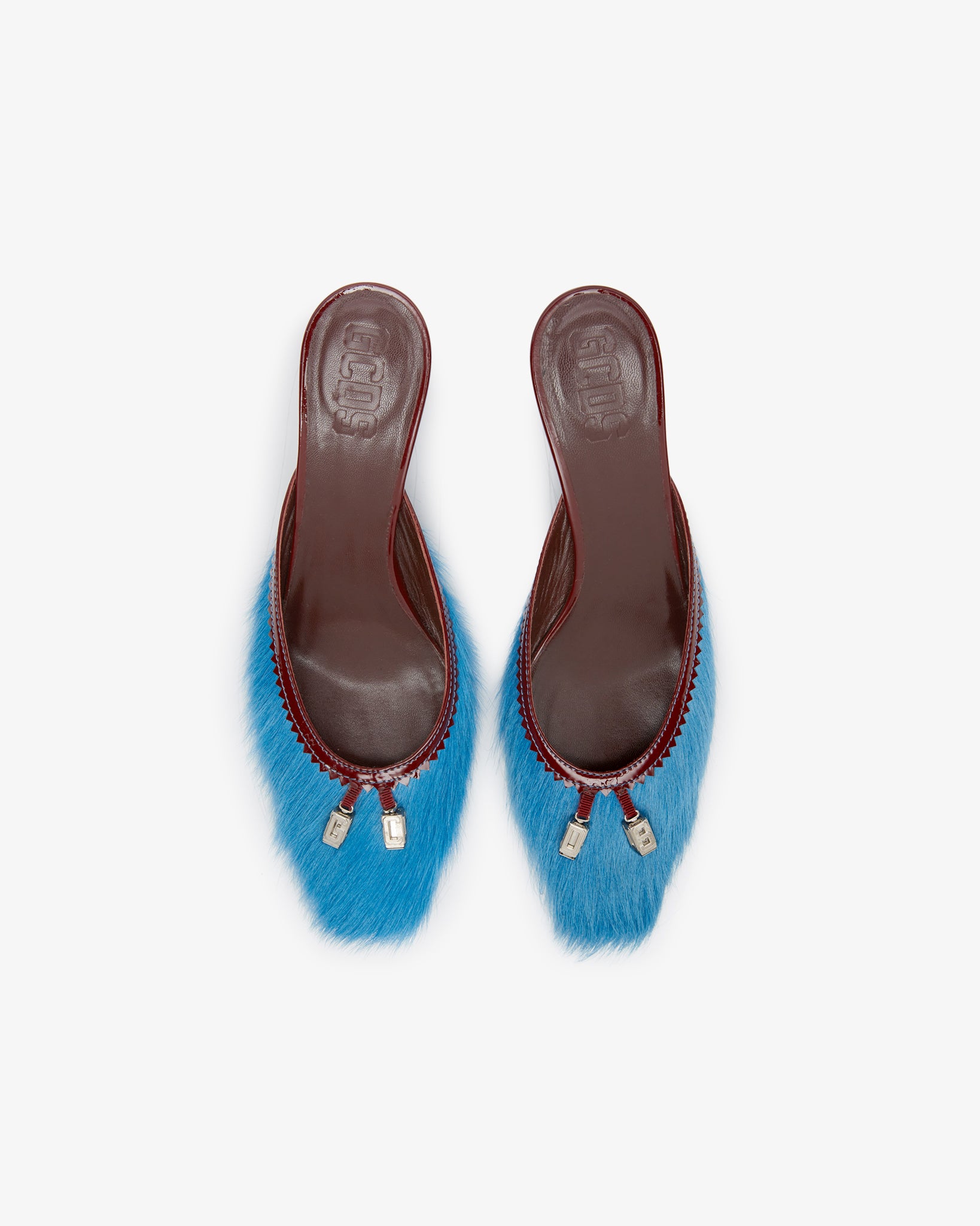 Mules with square toe made of long-haired pony skin. Contrasting burgundy finish characterised by tassels with "GCDS Cube" charm.